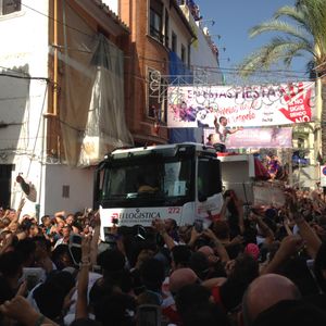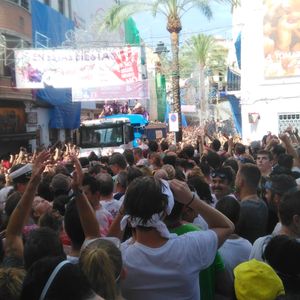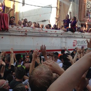 9時になると、パロハボン(石鹸が付いた木に登って生ハムを取るイベント?的な…)が始まります。石鹸で滑ってしまうため、なかなか登れず、少し登っただけでとても盛り上がります。ただ、それを2時間ひたすら見ているのは、正直、時間が長く感じます。11時になると、大砲が鳴り、いよいよスタートです。トマトを乗せたトラックが入ってくると、会場は一気に盛り上がりますが、トラックが通るたびに押しつぶされて、友人とはぐれる可能性も高く、息苦しささえも感じます。まさに、ガイドさんの言う通り、戦争です。満員電車なんてかわいいものと思えるような人の多さなので、出たいと思っても、終わるまでは全く動けません。心配な場合は、中心部(パロハボンの近く)から少し離れたところで待っているのがいいと思います。