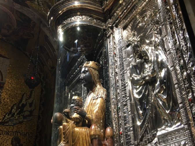 再度電車、登山電車を乗り継いで目的地修道院前到着(12:10)。周辺の奇岩とパワースポットである修道院中庭含めた見学を終え13時開始の少年聖歌隊の合唱を(ガイドさんが周りの方にお願いしていただき)前方座席で拝聴。幼少の頃から選りすぐられた少年の澄み切った歌声に心洗われました。そのあと聖堂の右手階段を上がり黒いマリアさま参り。その頃には外国人の団体も食事に出かけ待ち人数は15人以下でした。ガイドさんは黒いマリアさんのお陰で既に2つの願いがかなったと言われたので私は2つも願い事しました。お土産店経由で併設のビュッフェランチを済ませて15時ごろ今度は雨の中ロープーウエイで下山。市内には17時よりかなり早めに戻れました。ロープーウエイで降りたことで予定より早い電車に乗れましたが電車が1時間に一本であるためガイドさんのチケット含めた手配も有り難かったです。