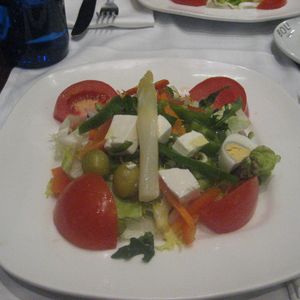 パエリヤは4種類から選べてシーフードにしました。食前酒にはカバとサングリアを頼み料理を待ちます。サラダはトマト、人参、オニオン、チーズ、ホワイトアスパラなどが入って彩り鮮やかでした。オリーブオイルとバルサミコ酢でいただきました。