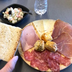生ハムなどの軽食とトマトのペーストをパンに塗って、赤、白ワインをグラスに3杯。デザートはミニチーズケーキ。