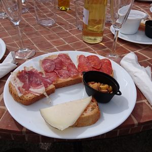 農家レストランでは日曜日限定のカタルーニャ地方の家庭料理が出てきて、ここでもたっぷりと生ハムやサラミ、焼き野菜、サラダなどとメインで炭火焼の羊や豚の骨付き肉とそれに合うワインも出てきて盛りだくさんでした。
