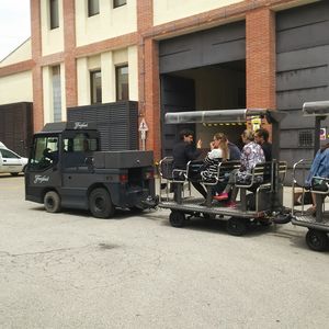 次はトレス社で工場の中を、トロッコで巡ります。大きな工場だね