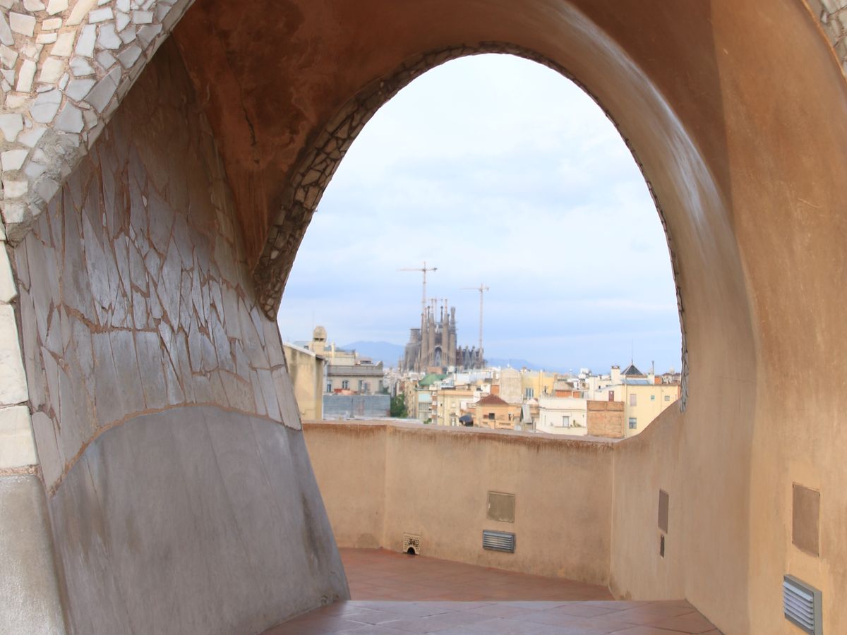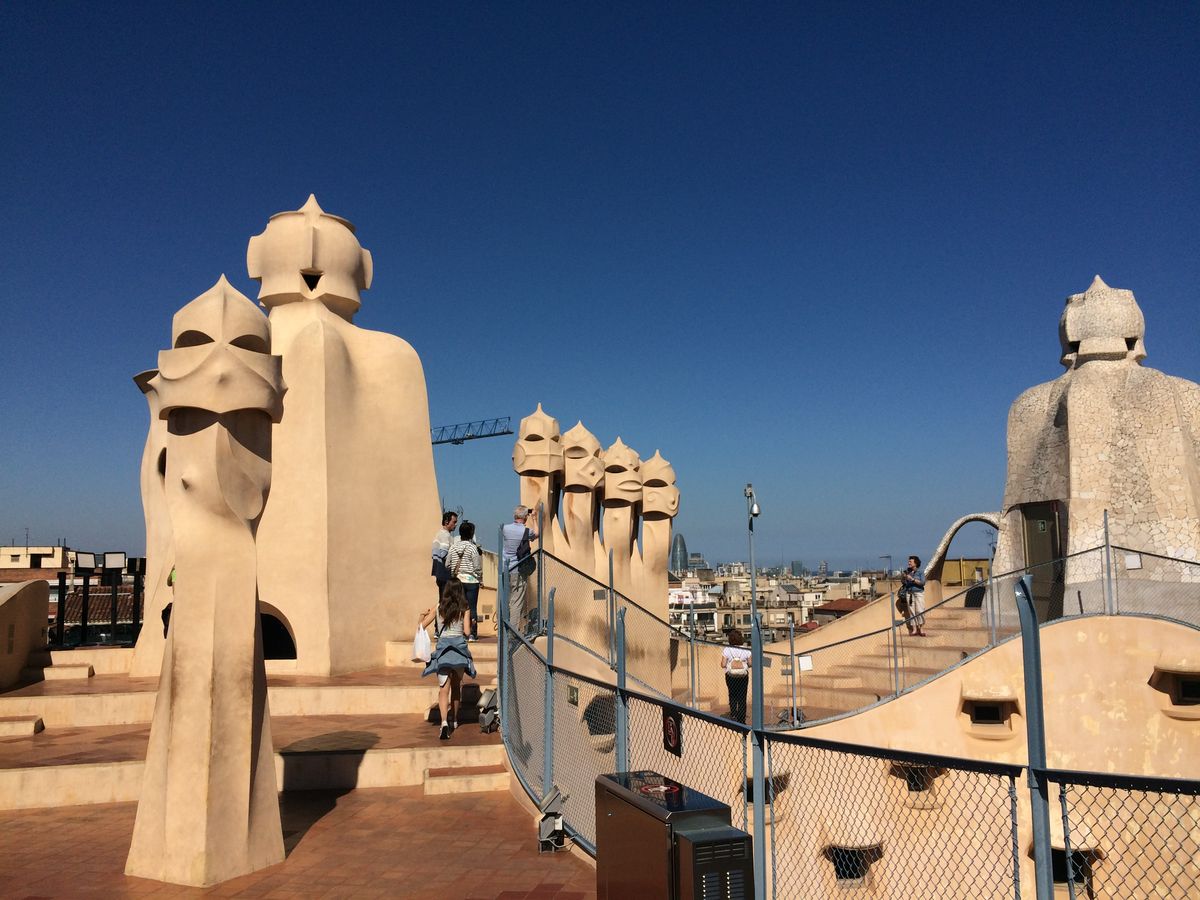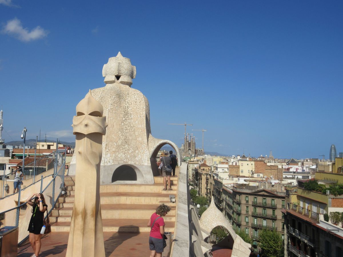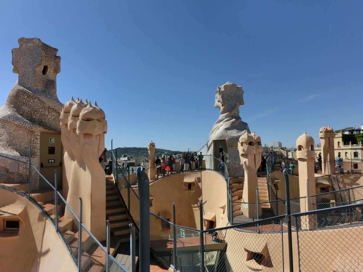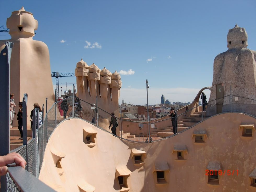 カサ・バトリョ見学の後に周ったので11:00頃になってしまったのでかなりの人が並んでいましたが、この事前予約のおかげでスムーズに入場できました。まずエレベーターで屋上へ行って天気が良かったのもあって写真を撮りまくり、サグラダアミリアも見えました。