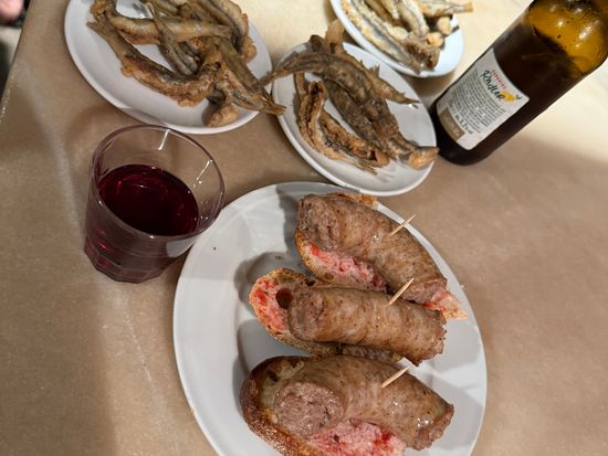 バルには3軒行きますが、普通にピンチョスを選べるお店のみならず、なかなか注文しにくいお店も紹介してもらえます。写真はその1軒。飲み物はベルムート。お店のメニューにもなかなか出てこないのですが、今流行りとの事で飲んでみました。 3軒行きますから、いろいろなものを少しずつ食べたり、いろいろな飲み物に挑戦できます。 バル巡りの途中は旧市街の見どころをしっかり案内してもらえますし、在住者ならではの効率良い動き方で時間の無駄もありません。当日はイベントが有ったのでそちらにも連れて行っていただきました。とても良いツアーです。