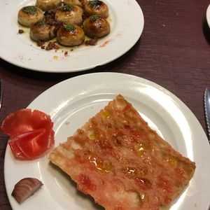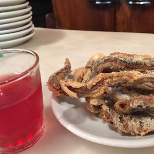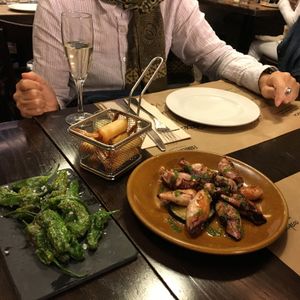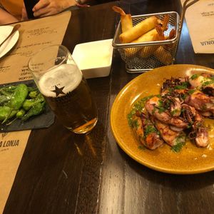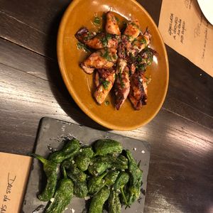 こちらはタパスのお店で、シシトウの素揚げとホタルイカみたいなイカの鉄板焼きニンニク、パセリかけ。