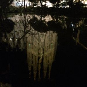 午前中にサグラダ・ファミリアの内部を見てからこの夜のツアーに参加しました。ホテルまで迎えに来ていただき、タクシーで旧市街に移動し、まだ明るいうちに徒歩で観光。バル2軒はしごした後、またタクシーでサグラダ・ファミリア近くに移動。正面の公園の池はあいにく水が抜かれていて、「逆さサグラダ・ファミリア」は見られませんでしたが、いくつもの塔が昼間とはまた違った迫力でそびえていました。