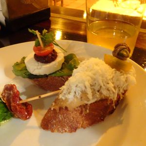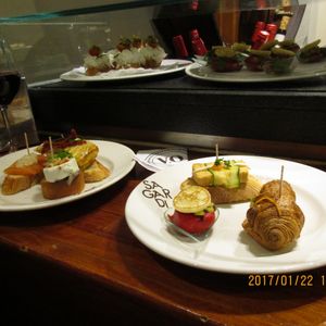 ベテランガイドのKさんが厳選した3軒で、ピンチョス、タパスを楽しみました。ピンチョスの店では1人3個と飲み物を選択。冷製と温製のメニューがありますが、慌てて冷製ばかり選ばず、温製が出てくるのを待つのがミソ。出来たてのクロケットとソーセージが絶妙でした。2ー3件目では、ガイドさんが約10種類のメニューを提示し、その中から参加者が選ぶ形式。この日は計5人の参加で店ごとに3〜4皿を食べ比べできました。バルを巡る途中、バルセロナの歴史にまつわる話も興味深く拝聴しました。サグラダ・ファミリアのライトアップも素晴らしく、かなり満足度の高いひと夜となりました。