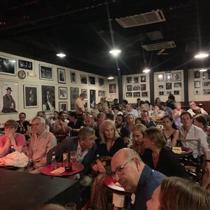 舞台に向かって5列くらい段差をつけて、くっつくように椅子が並べられて50人ほど満員。