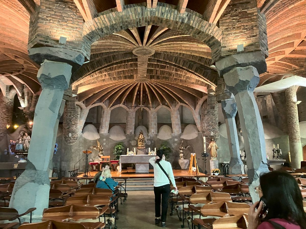 コロニア・グエルは大きな工業団地でそこに建てられた教会は途中で計画中止、ガウディ調と無機質な屋根などのアンバランスさが良かったです。
