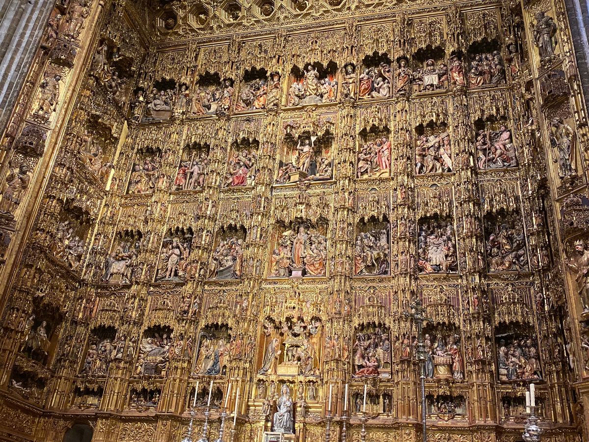 4日目。セビリアへ向け出発。途中断崖の村、ロンダへ立ち寄る。コロンブスの墓や巨大なパイプオルガン、黄金の祭壇などを有するセビリア大聖堂は、圧巻の一言。写真や文章で説明するのは不可能との思いを抱く。広い聖堂内はガイドの方が見どころを重点的に案内してくれ、効率よく回れた。隣接するヒラルダの塔は100mほどの高さがあり、ほとんどが階段ではなくスロープを登って行く為、多少、楽に感じたが、運動不足の私達には厳しかった。しかし、てっぺんからは、セビリアの街を一望出来るのでお勧め。