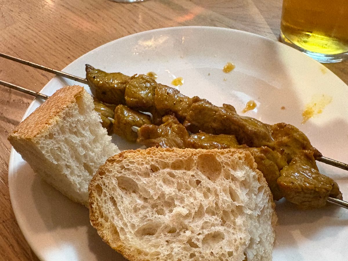 3軒目は ビールと ロゼワイン: ラムの串焼きと大きなマッシュルームのオーブン焼きでした 出来たてで熱々でした ラムの串焼きは店主がスペインに移住後初めて提供されたスペシャルメニューでした今は大好評の一品です