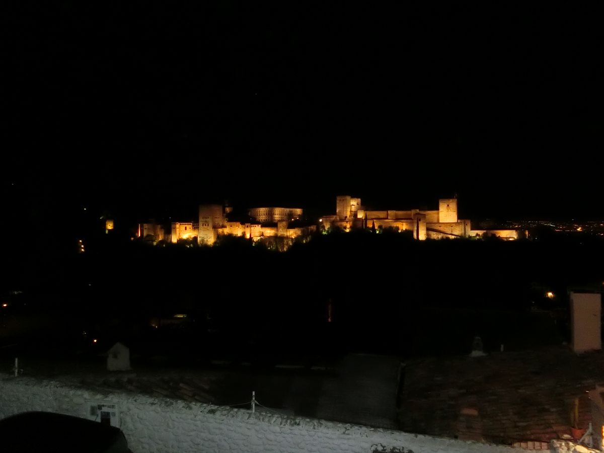 帰りにアルハンブラの夜景スポットに案内してくれた。バスを降りたところで見るのかと思っていたら、細い路地を抜けて坂を登っていった。この地区を歩けるのは思わぬ収穫だったが、暗い夜道、階段には注意したい。夜景は素晴らしかった。