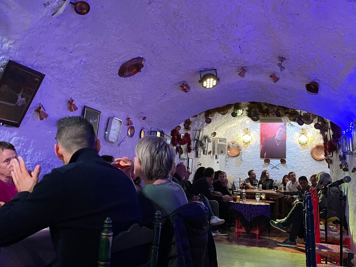 ホテル近くのバス停から市バスで向かいました。開催場所はバス停のすぐ近くです。バス停近くからアルハンブラ宮殿の夜景が綺麗に見えました。写真にある様に演者の直ぐ横で見れてとても良かったです。後から来た人は後ろへ案内されていたので、早めに行って良い席を確保する事をお勧めします。
