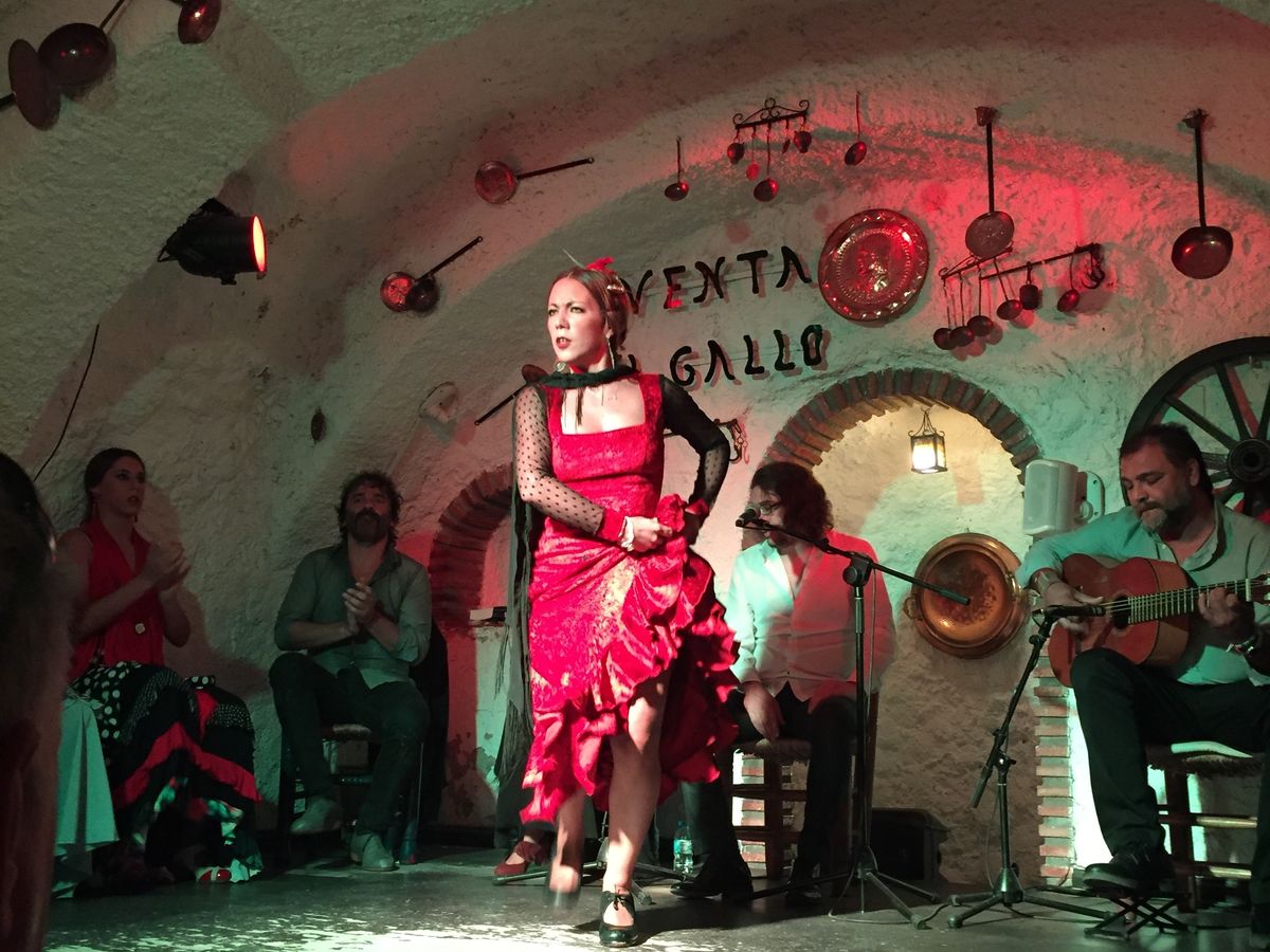 ピックアップ時間より少し遅れましたが、無事高台にあるタブラオへ。ツアーでなければ迷ってしまうし、街灯が少ないので夜ここまではこれないと思いました。無事席に座って、ショーが始まると、どんどんダンスに引き込まれて行きます。表情や足さばき、とても魅力的です。途中、観客も一緒に踊る場面があり、たまたま私も参加したのですが、意外と簡単なんじゃ?と思っていた踊り、盆踊りになってしまいました(笑)とても楽しかったです。サングリアが1杯つきます。ほろ酔い気分で楽しいグラナダの夜になりました。
