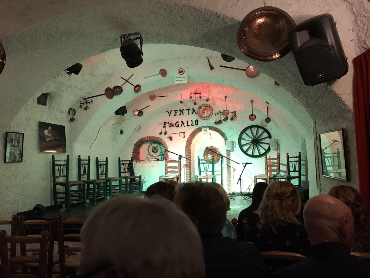 グラナダの洞窟ということで、暗い山の方へマイクロバスが上がっていきました。アルハンブラ宮殿が向こうに見える夜景はいいものでした。到着した「洞窟」の入口を入ると写真で見たこじんまりとした白い半円形の空間で、回りに小さな椅子が敷きつめられ、そこに順々に座り開演を待ちました。