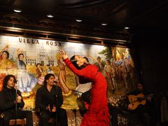 とても賑やかで雰囲気のあるサンタ・アナ広場にある老舗タブラオ「ビジャ・ロサ」。1911年創業、セルビアの風景をモチーフとしたタイルの外観がひときわ目を引きます。店内は広く、食事をしながらでもゆっくりと情熱のフラメンコをお楽しみいただけます。
