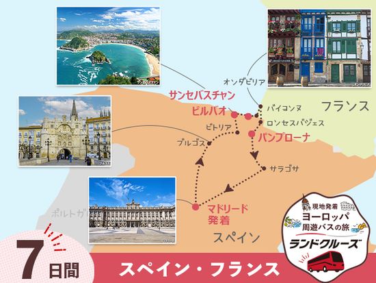 マドリード→ブルゴス→ビトリア→ビルバオ→サン・セバスティアン→オンダリビア→バイヨンヌ→ロンセスバジェス→パンプローナ→サラゴサ→マドリード