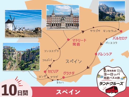 マドリード→サラゴサ→モンセラット→バルセロナ→ペニスコラ→バレンシア→グラナダ→マラガ→マルベーリャ→ロンダ→セビリア→コルドバ→コンスエグラ