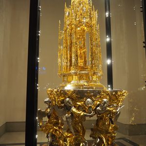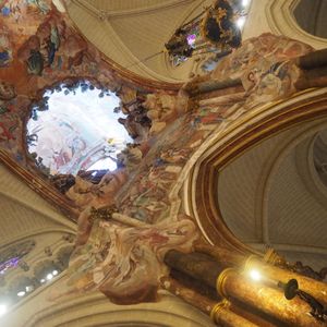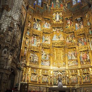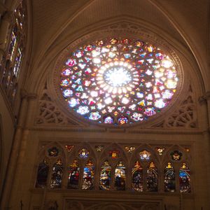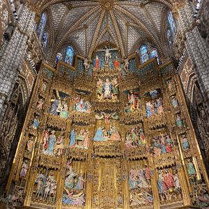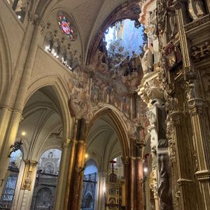 このツアーのメイン、1942年に完成したトレド大聖堂はゴシック様式の荘厳な聖堂で、その装飾は圧巻でした。「バラ窓のステンドグラス」やエル・グレコの「聖衣剥奪」、主祭壇の裏側にある「トラスパレンテ」透かしの入った天使や聖母像の装飾が見事でした。コロンブスが新大陸(アメリカ)から持ち帰った金も使われた、「聖体顕示台」はダイヤモンド、ルビー、エメラルドの宝石も惜しみなく使われて当時世界の覇権を握っていたスペイン帝国の繁栄を象徴するかのようでした。
