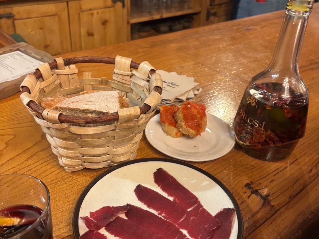 食事の後、土産物屋でワインとオリーブオイルを購入し、高台にあるセゴビアの街が一望できるパラドールで夜景を眺め、また、高速バスでマドリッドに戻った。マドリッドでは、ホテル近くのバルに案内してもらい、「からすみ」と牛の生ハムを摘みに、チェリー酒を味わった。