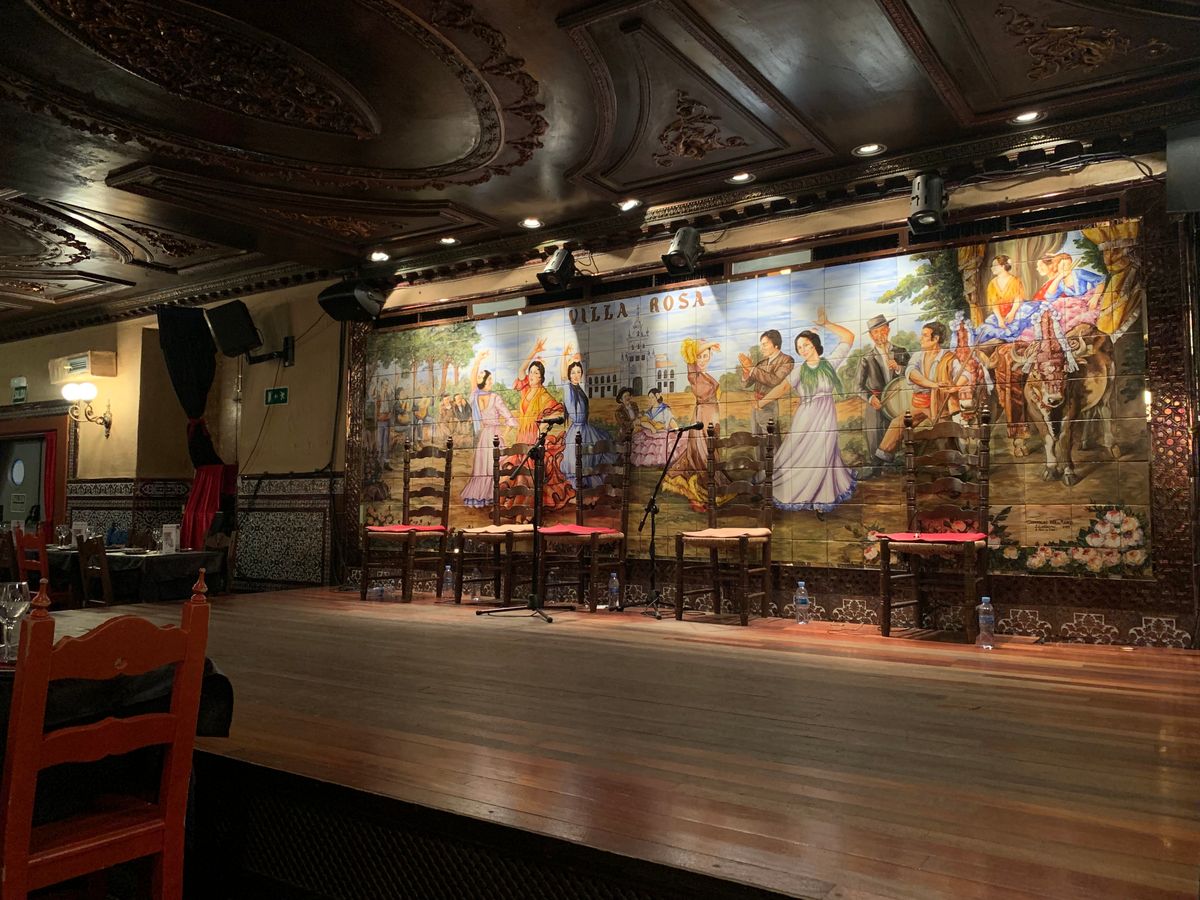 ステージからは一区画離れた正面のテーブルに案内されました。目の前に人が居なかったのと、真下過ぎず、で十分に満喫できました。お料理もテキパキと出してくださり、観賞しながら美味しくいただくことができました。なお、ステージが始まると照明が落とされるので、お料理がどんな感じかを薄明かりの中楽しむことになる…でした。写真の撮影は自由にさせてくださる感じでした。自分はうっかり他のツアーと勘違いして、最後だけしか撮影しちゃダメなのかな?と思い込んでしまっており、もう少しあとで振り返ってすごかったなぁ、よかったなぁと思う用に撮らせていただいておけばよかったなぁ…と思いました。大きなホールのようなところよりも、間近で拝見でき、迫力も格別。スペイン旅行中に、三度フラメンコを拝見しました(バルセロナとコンサートホール)が、ここのものが一番よかったです。
