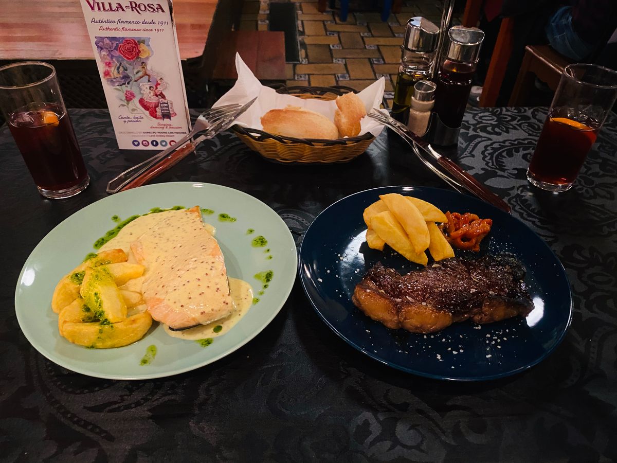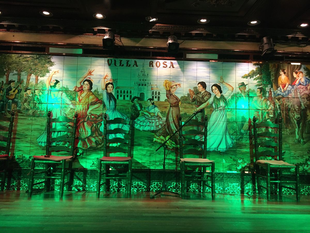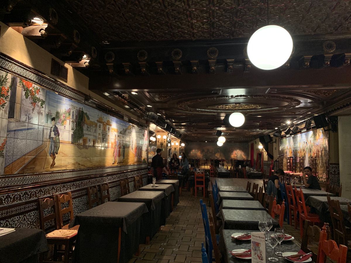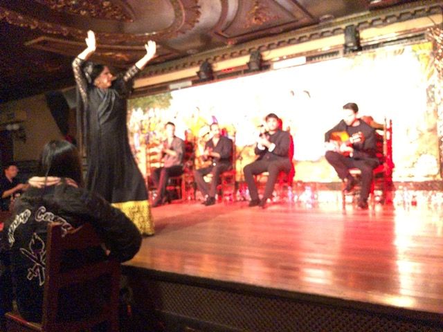 集合時刻18時半に行った。バーでちょっと待っていると、席に案内していただけて、場所は舞台に向かって横に並ぶ二人席でした。まず料理を食べてそのあと1時間ほどショー。料理は思ったよりいけていて食べれた。ステーキうを注文したが、200gほどあったか食べ応えがあったし、まあまあおいしかった。ショーもギターと踊りて2人と歌い手2人の計五人。手拍子に合わせて手をたたいている人は、たたかないように注意されていた。一緒に盛り上るというより、むしろ静かにフラメンコ、ギター演奏を聴くという雰囲気です。