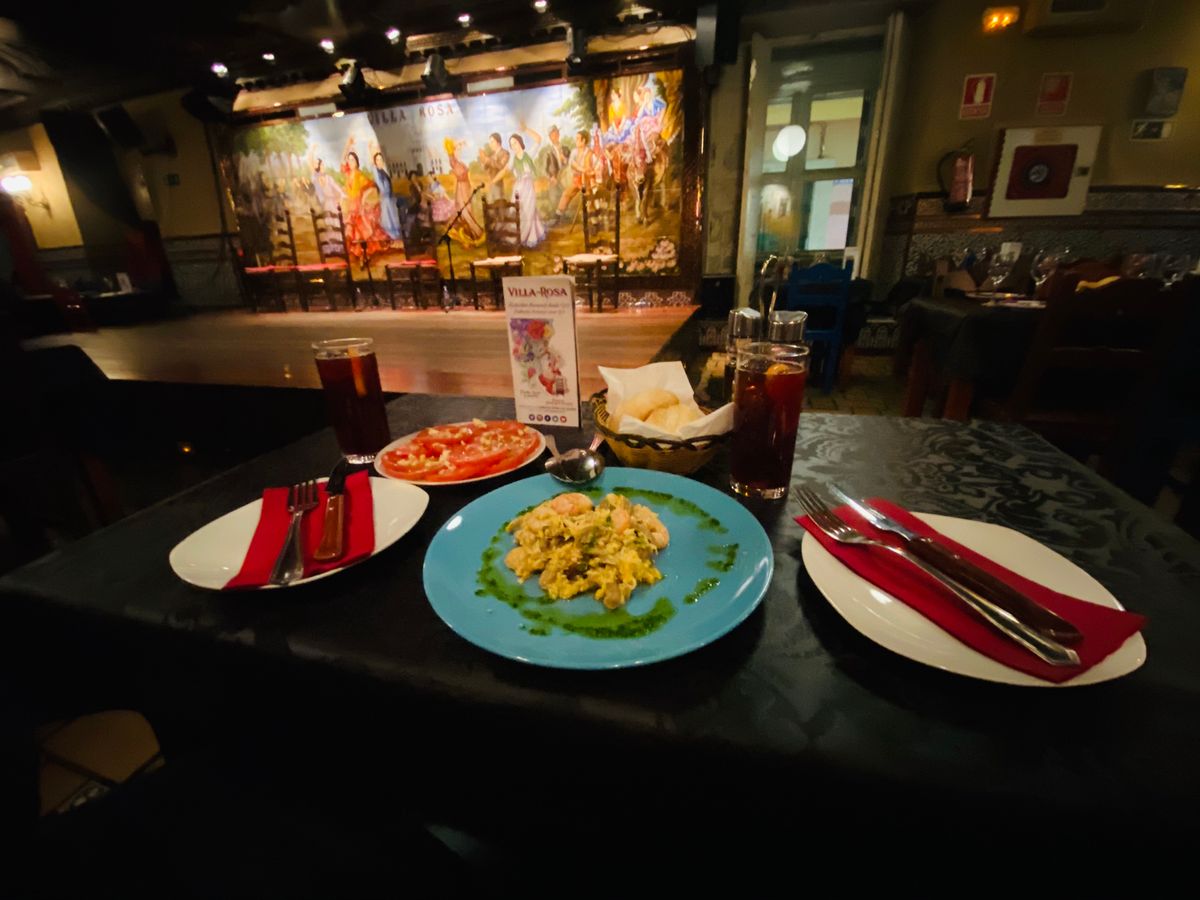 19時からのフラメンコで18:30にお店のドアがあき、順番に案内されます。ドアの前にいたので、ステージの1番前の席に案内してもらいました。フラメンコは大迫力で目が離せないので始まる前にごはんは食べておくことをお勧めします。50€のディナー付きを選びましたが、フライ、生ハム、オムレツなどの前菜とパエリア、デザートとボリュームがあり、充分お腹が満たされました。とてもお値打ちで大変満足度の高いものでした。
