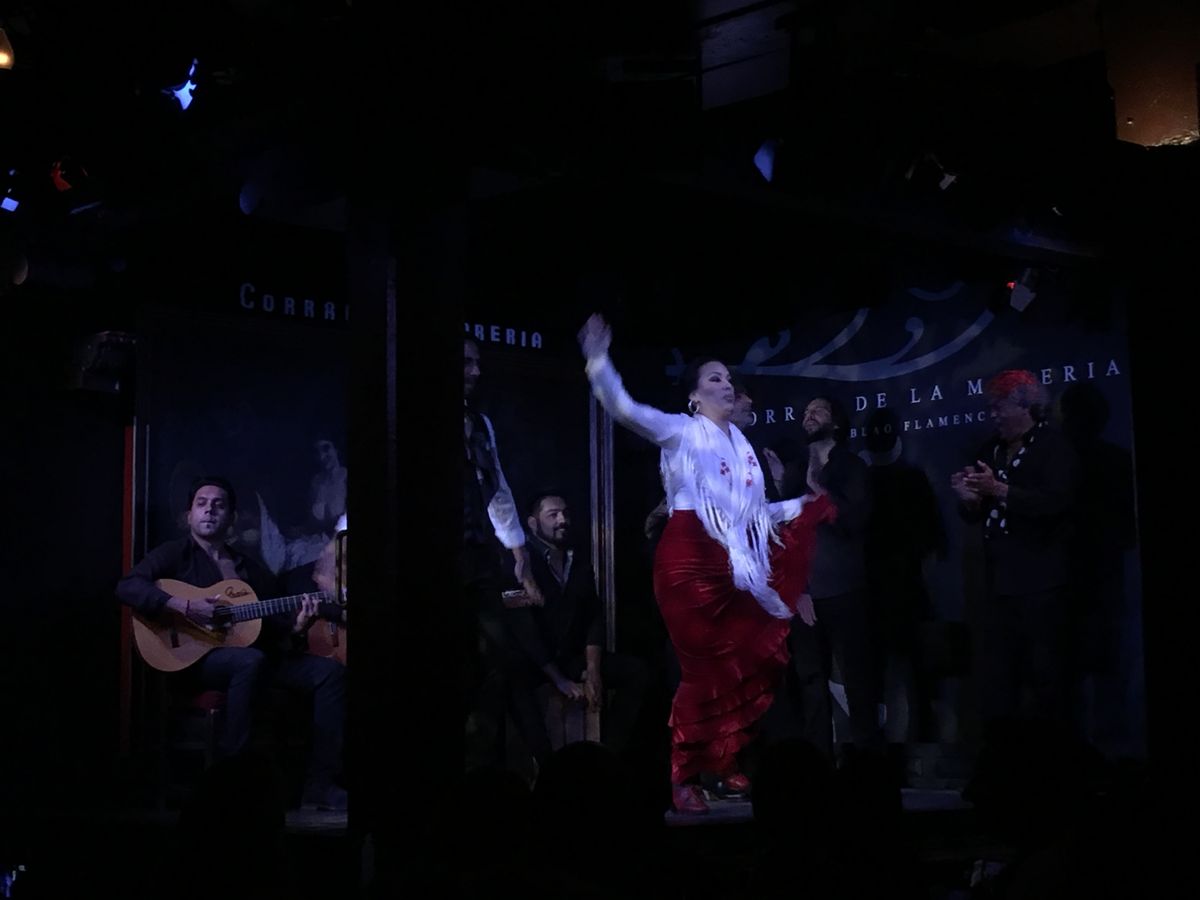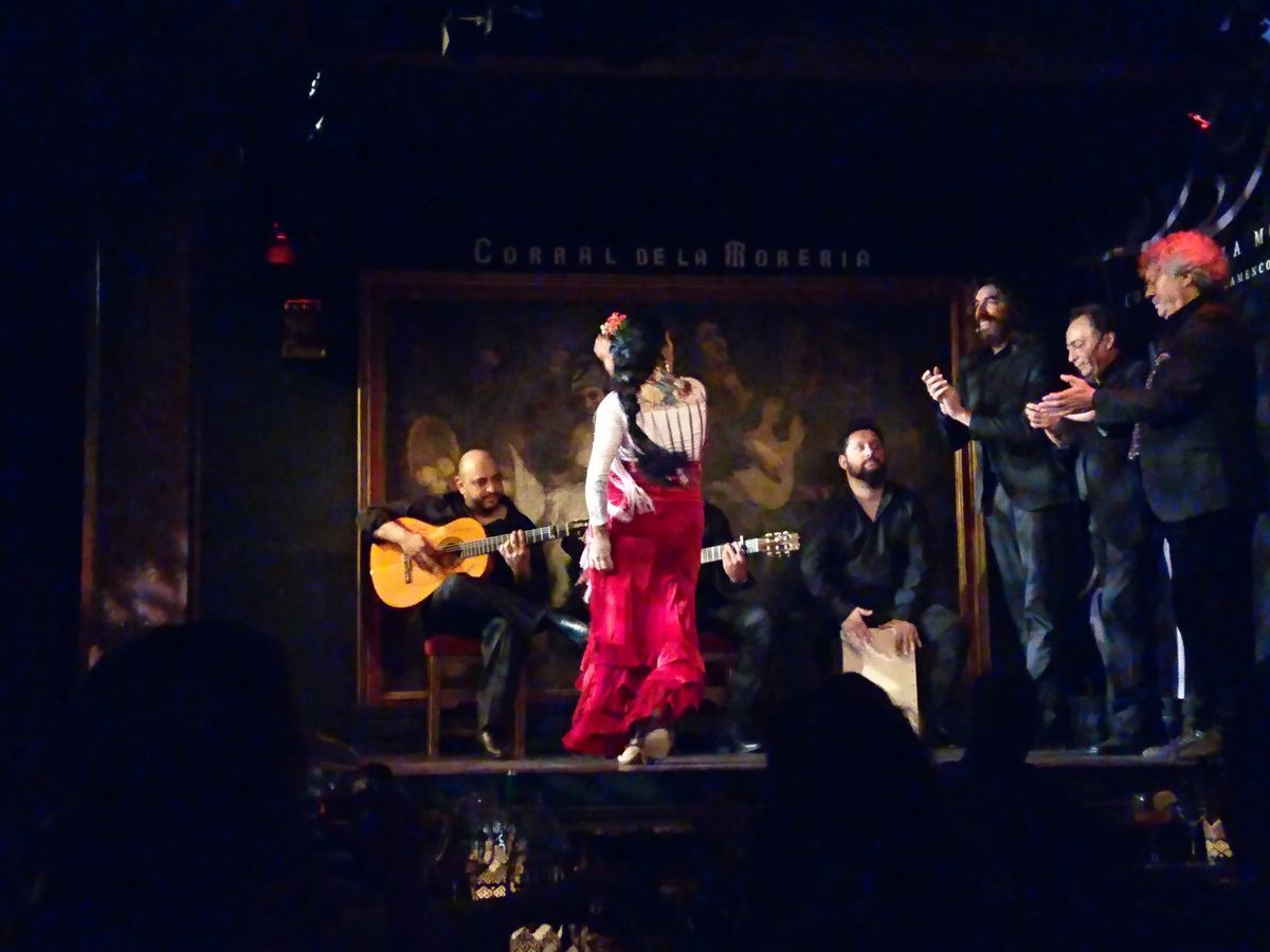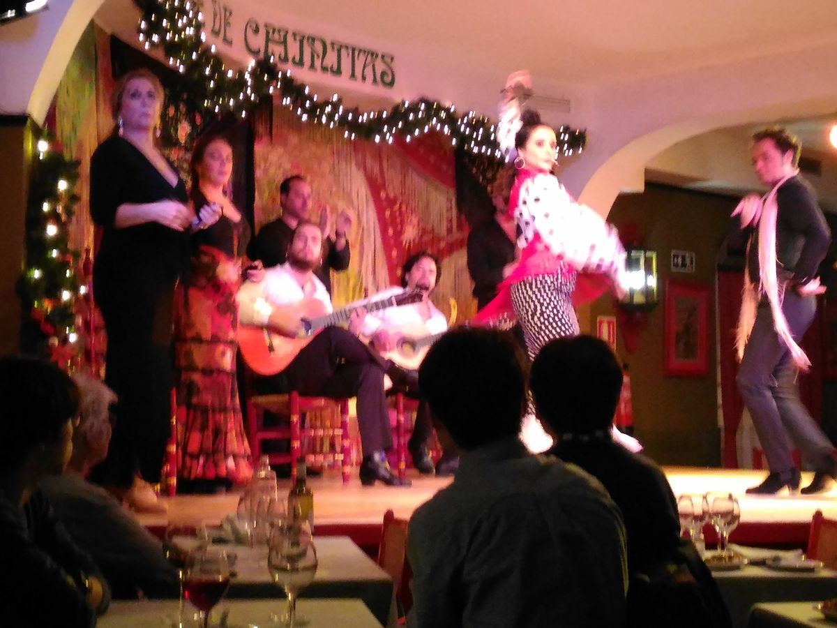フラメンコは初めてなので、他店との比較は出来ませんが、踊り3組、歌、ギターの編成で、質の高い踊り、演奏と思いました。プエルタ・デル・ソルからも徒歩圏ですし、地下鉄も近くに2駅あるので、アクセスも周辺の治安も良いです。ドリンクのみのコースにしました。前列に食事つきの人、ドリンクのみはその後ろになりますが、4列程度なので後ろでも見えにくいということはないと思います。店に着いたのが開演10分前くらいだったのでほとんど席が埋まっていて2列目の端の方になりましたが、問題なく見れました。着いた順に真ん中あたりの席から案内しているようだったので、真ん中の席で見たい場合、早めに行くことをお勧めします。