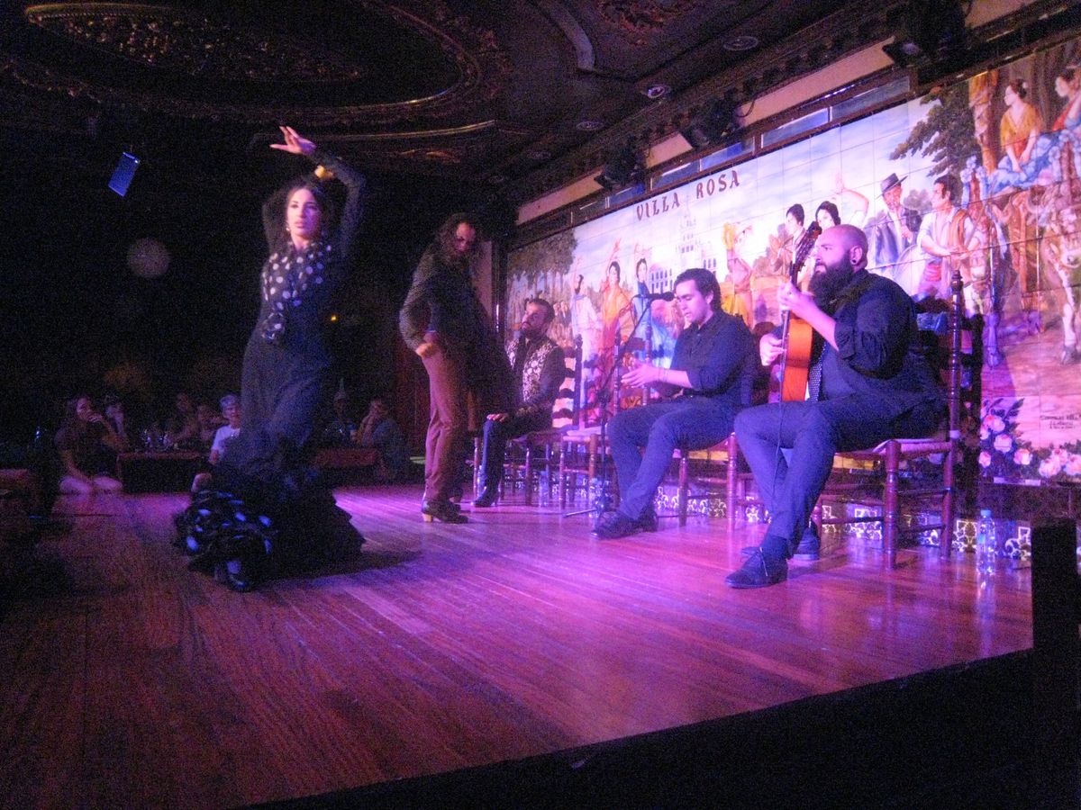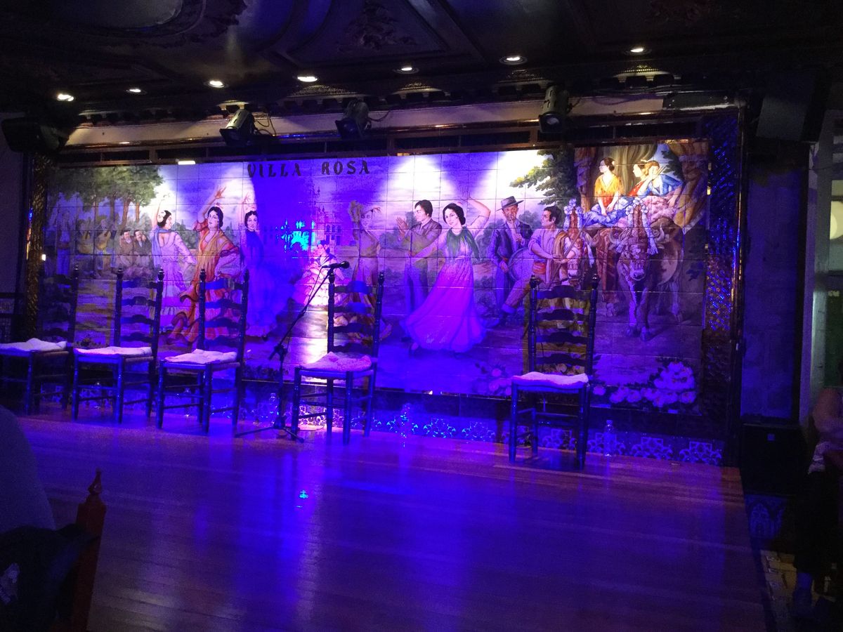 初めてのスペイン、初めての夜間外出という事で立地から選んだVILLA ROSAへ往復タクシーを利用しました。19:30の予定時刻15分前に到着したところ一番乗りだったみたいで、手前のバーカウンターで好きなものを飲んで構わないから少しウエイトしていてと親切な対応。座席も2人並んで正面を向いて座れるステージ席をキープして頂けました。事前に動画とフラッシュ以外の撮影はOKとの説明を受け撮影に最適なベストポジション席でした。これもVELTRAさんの力と信じています!?。内装も外装もとても雰囲気がありステージも広く素晴らしいタブラオです。ショーは5人構成(ギター、歌声、踊り手男1、女2)ですがどれも鳥肌が立つくらいの気迫にとても感動しました。本場のフラメンコ最高!