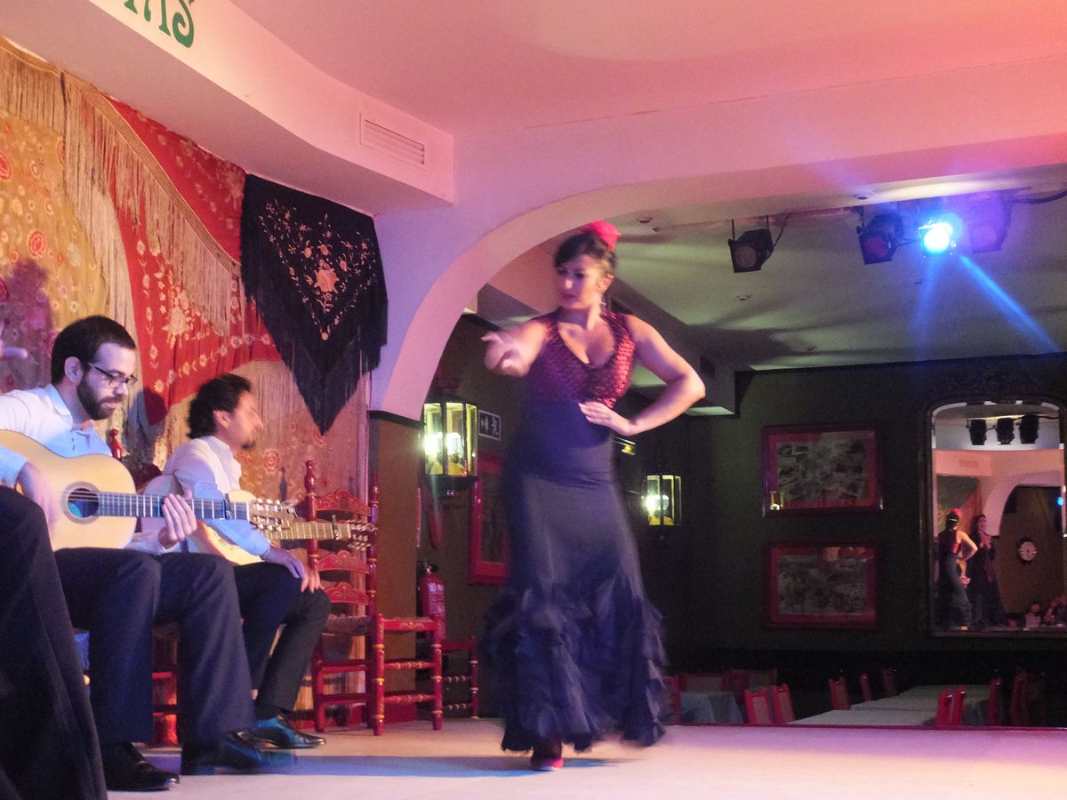 2月の中旬の平日に夫婦で行きました。平日のせいか思ったより人は少なく、7〜8組だったと思います。ほとんどが観光客、1組だけ地元の方なのかフラメンコの関係者なのかそんな感じのお客さんでした。その日はみんなワンドリンクのチケットであまり食事はとっていなかったようです。私たちはワンドリンクの他に1つだけつまみを頼みました。コロッケを頼んだのですが味は微妙。フラメンコは50代の女性が2人と30代くらいの女性が1人、歌い手が2人とギターが1人。迫力があり楽しそうに踊り様子を見てこちらも楽しく観させていただきました。観客がもっといるともっと盛り上がったかもしれませんね。でも少ない観客で観るのも贅沢な時間で、ステージの目の前で見られましたしウエイターさんにもすぐ注文したりできたので良かったです。