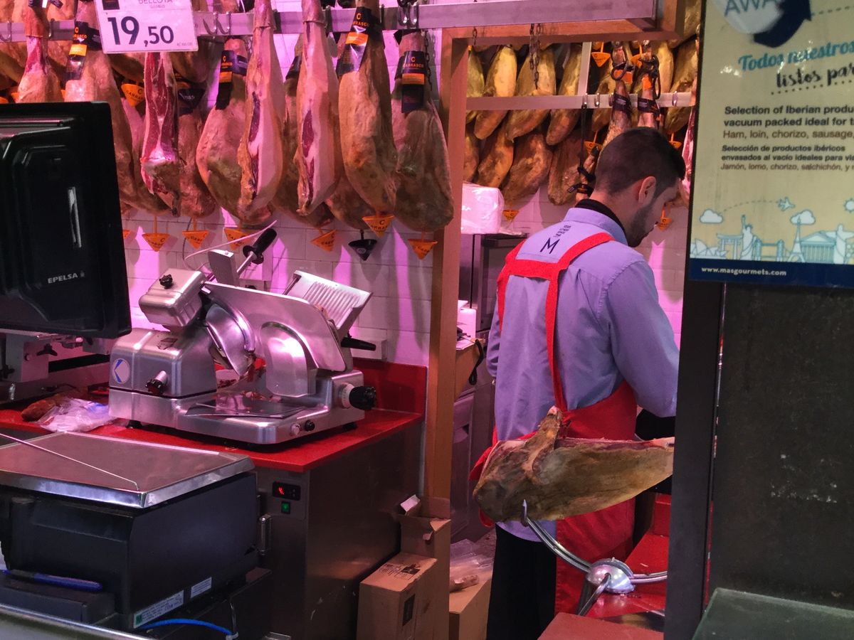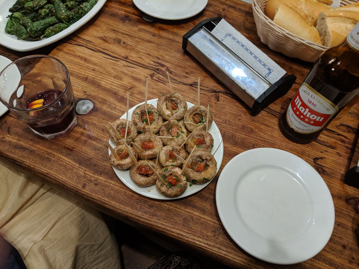 予定の時間を、20分以上遅れてしまった私達が、悪いのかもしれません。しかし、バル巡りとありましたが、バルには1軒しか行かずしかも名物マッシュルームを一皿のみ。サンミゲル市場に行って、パエリア一皿、オリーブのピンチョス二つ、最後にチュロス4本とホットチョコレート1杯のみでした。子豚の丸焼きの店に写真だけ撮りに入店し、スーパーマーケットでミネラルウォーターと板チョコ一枚買ってもらい終了。街中を歩いても一切説明なしでガイドさん自身の人生を語られる始末。バルセロナでもおなじようなツアーを参加してあまりの差に愕然としました。ガイドの当たり外れってあるんですね。返金して欲しいくらいです。