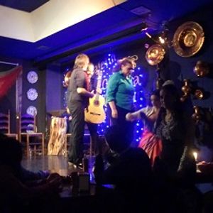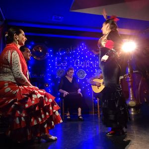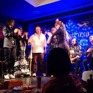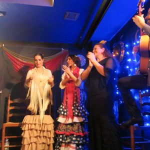 2月の中旬の平日に夫婦で行きました。平日のせいか思ったより人は少なく、7〜8組だったと思います。ほとんどが観光客、1組だけ地元の方なのかフラメンコの関係者なのかそんな感じのお客さんでした。その日はみんなワンドリンクのチケットであまり食事はとっていなかったようです。私たちはワンドリンクの他に1つだけつまみを頼みました。コロッケを頼んだのですが味は微妙。フラメンコは50代の女性が2人と30代くらいの女性が1人、歌い手が2人とギターが1人。迫力があり楽しそうに踊り様子を見てこちらも楽しく観させていただきました。観客がもっといるともっと盛り上がったかもしれませんね。でも少ない観客で観るのも贅沢な時間で、ステージの目の前で見られましたしウエイターさんにもすぐ注文したりできたので良かったです。
