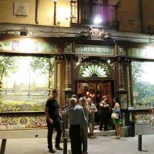 初めてのスペイン、初めての夜間外出という事で立地から選んだVILLA ROSAへ往復タクシーを利用しました。19:30の予定時刻15分前に到着したところ一番乗りだったみたいで、手前のバーカウンターで好きなものを飲んで構わないから少しウエイトしていてと親切な対応。座席も2人並んで正面を向いて座れるステージ席をキープして頂けました。事前に動画とフラッシュ以外の撮影はOKとの説明を受け撮影に最適なベストポジション席でした。これもVELTRAさんの力と信じています!?。内装も外装もとても雰囲気がありステージも広く素晴らしいタブラオです。ショーは5人構成(ギター、歌声、踊り手男1、女2)ですがどれも鳥肌が立つくらいの気迫にとても感動しました。本場のフラメンコ最高!