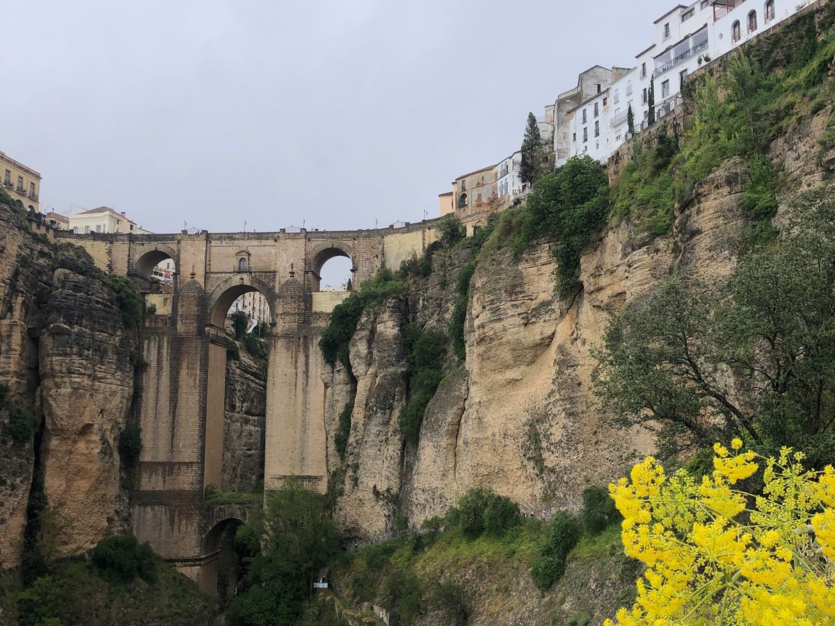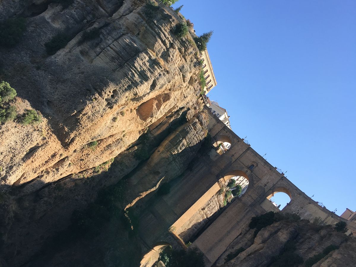 ロンダの石橋へはバスでは通れない細い田舎道を通って、橋の真下に到着。崖底地点で見上げる絶景をロッククライミングをする若者2人と堪能しました。