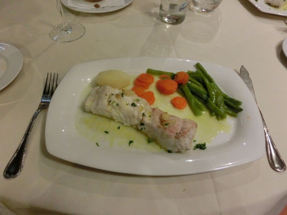 魚料理がメインの夕食。赤ワインで楽しむ。