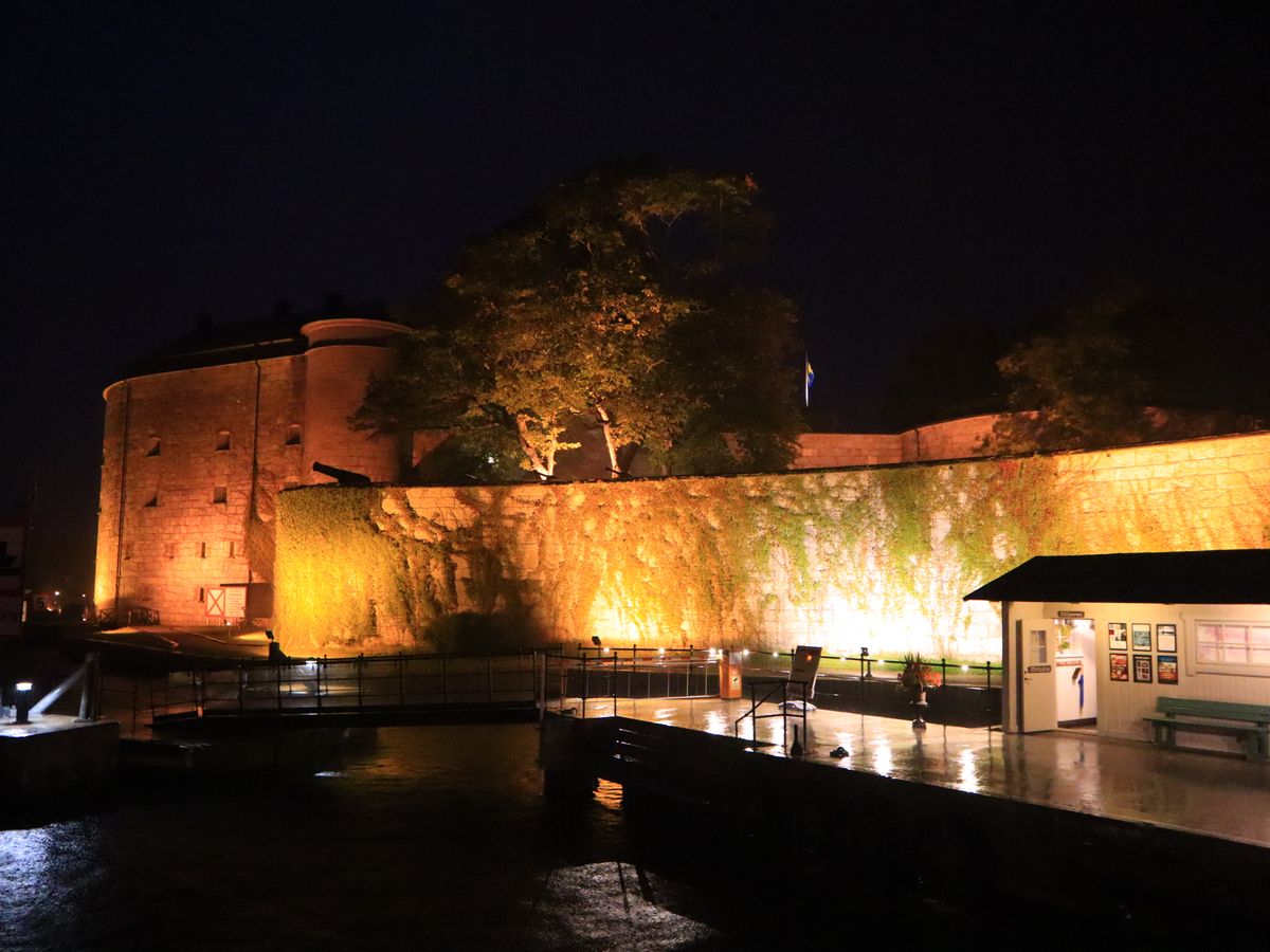 折り返し地点のVaxholm Castleはライトアップされて見事な景観でした。