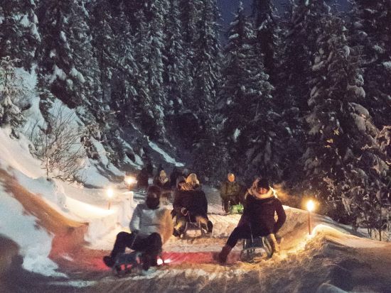 そり滑り体験ナイトツアー チーズフォンデュのディナー付き <12~3月/英語ガイド/インターラーケン発>