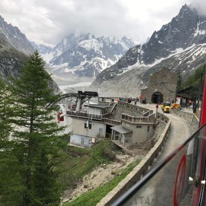 その日は日本人が多かったためか、観光名所の説明は英語でしたが、日本語でツアーの説明がありました。ツアーコンダクターの日本語力は十分で、優しく説明していただきました。十分このツアーには払っただけの金額の値打ちがあったと思います。残念ながら天候は時折小雨がぱらつく曇りでモンブランの頂上は見えませんでしたが、十分楽しめました。ロープウェーの頂上ではウィンドブレーカーを通常の服装に加えただけですが、それで十分でした。頂上では雪が降っていました。列車では氷河を見た後階段を350段ほど登りますが、普段運動不足の妻にはかなりきつそうでした。後一つ気づいたのはジュネーブのスーパーよりもシャモニーのスーパーの方が物価が安く、最後1時間シャモニーで自由時間があるのですが、妻は忙しくお土産を探していました。