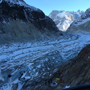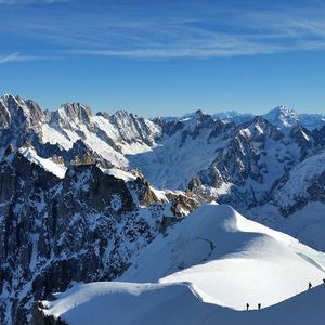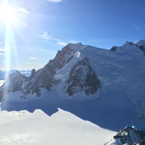 今回ジュネーブ留学の最後にせっかくだからモンブランに行きたいと思いこのツアーに参加しました。ツアーの内容は、日本語ガイド付きで、エギーユ・デュ・ミデイへのロープウェイ往復、モンタンヴェール、メール・ドゥ・グラス氷河往復、昼食が含まれました。ガイドさんは、日本語が堪能で、ほとんどいない日本人の方にも気さくに、丁寧に説明していただきました。当日の朝、ジュネーブの天気は曇りでしたが、シャモニー・モンブランは幸運にも快晴でした。到着後、午前中は展望台のあるエギーユ・デュ・ミデイへ、ロープウェイを2回乗り継ぎ、エレベーターで最も高い展望台に着きました。見渡す限り絶景、天気がよかったおかげで周りの山々がはっきりと観ることができました。