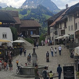 12:30くらいに最終目的地の Gruyeres 村に到着、2時間15分の自由時間が与えられたので、村中央の噴水近くのレストランに入って昼食です。いままで「チーズフォンデュ」と云うものを食べたことがなかったので、生まれて初めて食べました。このレストランは「チーズフォンデュ」の専門店ぽくなっていたので、様々なチーズの種類から選択可能ですが、適当に一品を頼んで食事開始。始めは目新しさもあっていいのですが、3分の1くらい食べるとその味の単調さのせいか、急激に飽きてきます。単品で1人前が約6,000円なので、「ここで残したら、日本のお天道様の罰があたる」と副菜のピクルスの力も借りて完食しました。