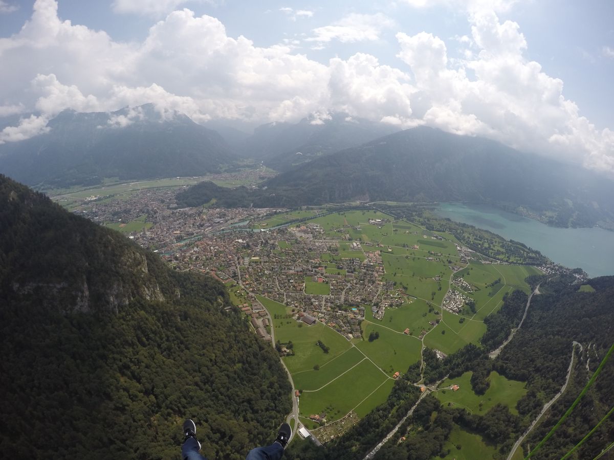 離陸の際は、インストラクターからの「走って!」との指示に従うと、予想よりあっけなく斜面から浮き上がりました。真っ白な雲を抜けると、インターラーケンの街全体とそれを囲む山々が眼下に広がりました。インターラーケンの街並みに河川のエメラルド色が映え、絶景です。飛行時間中は腰掛けるようなリラックスした姿勢で風景を楽しむことができ、インストラクターが沢山写真と動画を撮ってくれます。着地地点の公園が見えてくると、「クレイジーな降り方とゆっくりな降り方どちらがいいか」ということを聞かれ、私は風景を少しでも長く楽しみたかったのでゆっくりでお願いしました。ちなみに、クレイジーな降り方をお願いすると急旋回しながら高度を下げていくためスリル満点になるようです。着地の仕方は、空中で立つように姿勢を起こし、足を動かすくらいで難しくありません。インストラクターが丁寧に説明してくれます。