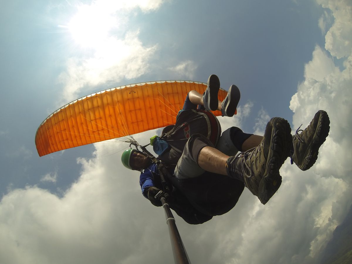 母、娘、息子の順に順調に飛び出していき、空に浮かぶのを見届けて、私もインストラクターのステップに押されるように、斜面を数歩駆け降りると、フワッと身体が浮きました。受ける風の強さに、一瞬、あらぬ想像をしてしまいましたが、一旦、空に出てしまえば、もう何を心配しても、お任せして楽しむしかありません。
