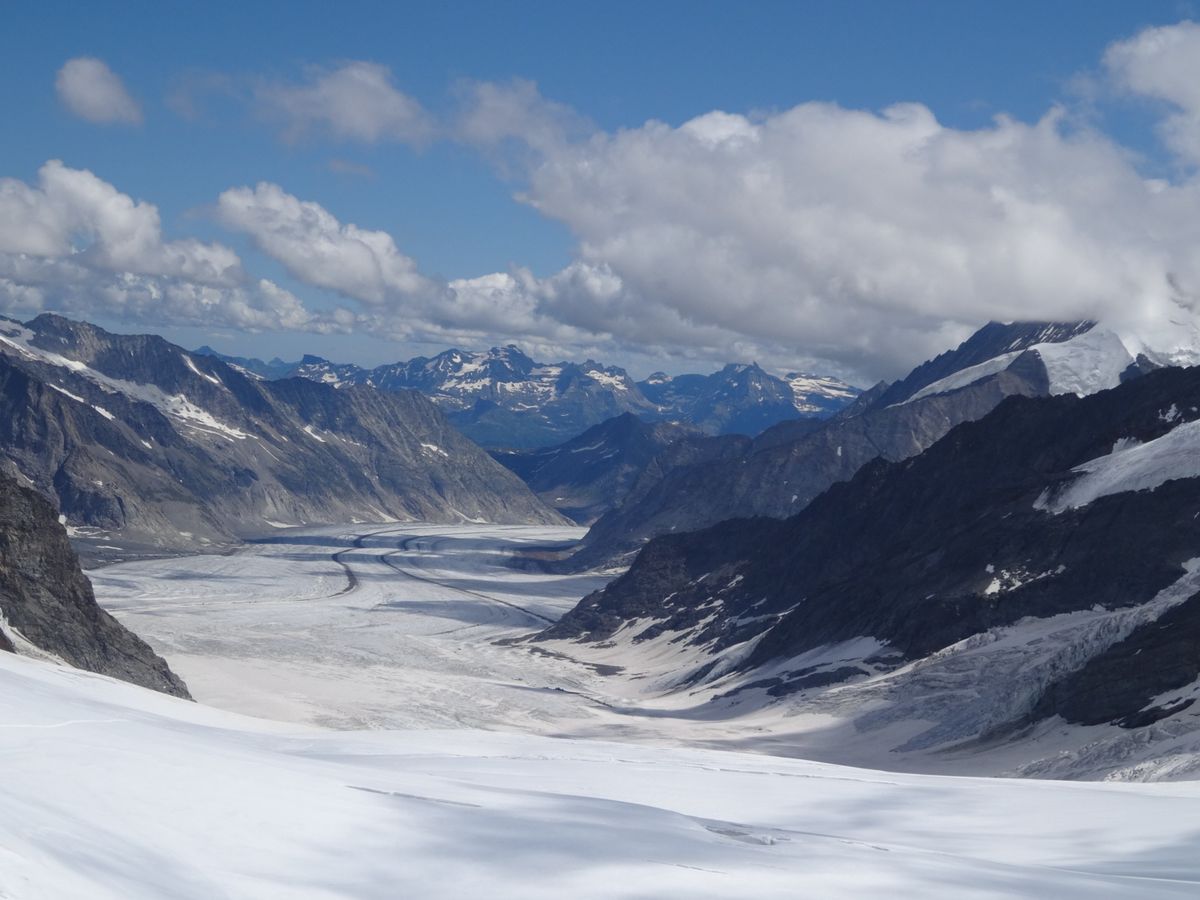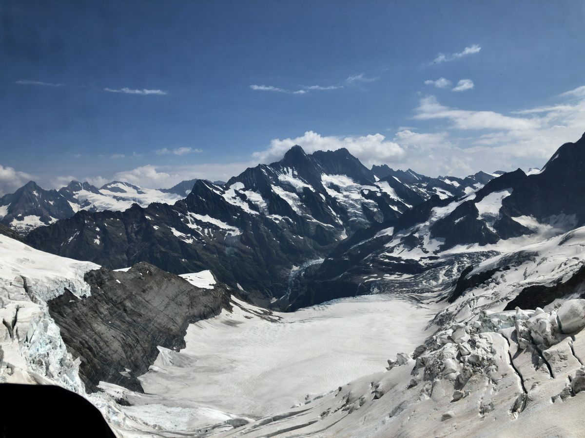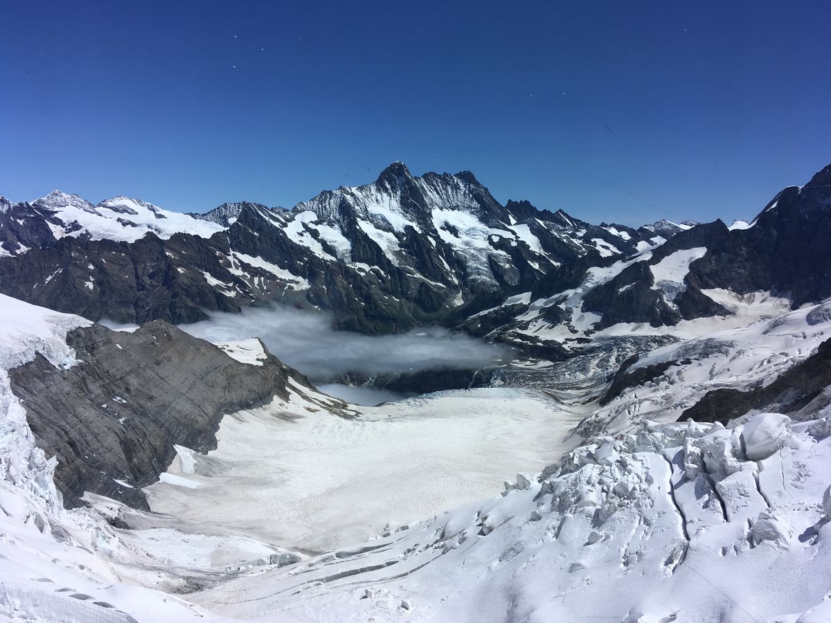 晴天に恵まれて、ユングフラウヨッホからはアレッチ氷河もユングフラウも大迫力で見渡せ、大満足の一日となりました。山の天候は運次第ですが、雨上がりの晴天は水蒸気が山に上がってくるので、山の麓は晴れていても、山の上は違うことがあります。