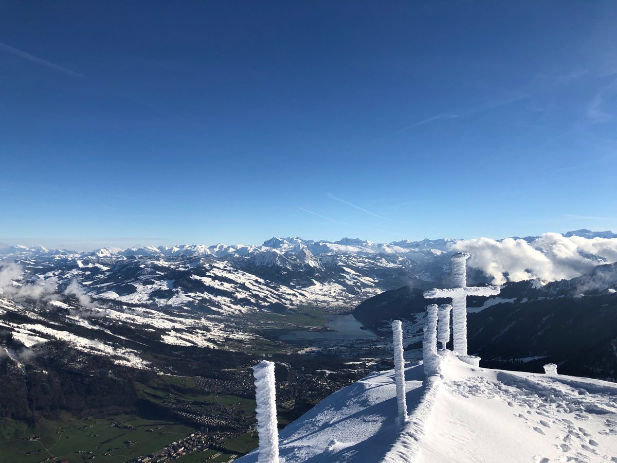 冬ということもあり、道中やルツェルンは雲っていたが、リギの山頂は雲の上になるので晴れており最高の景色を見れた。