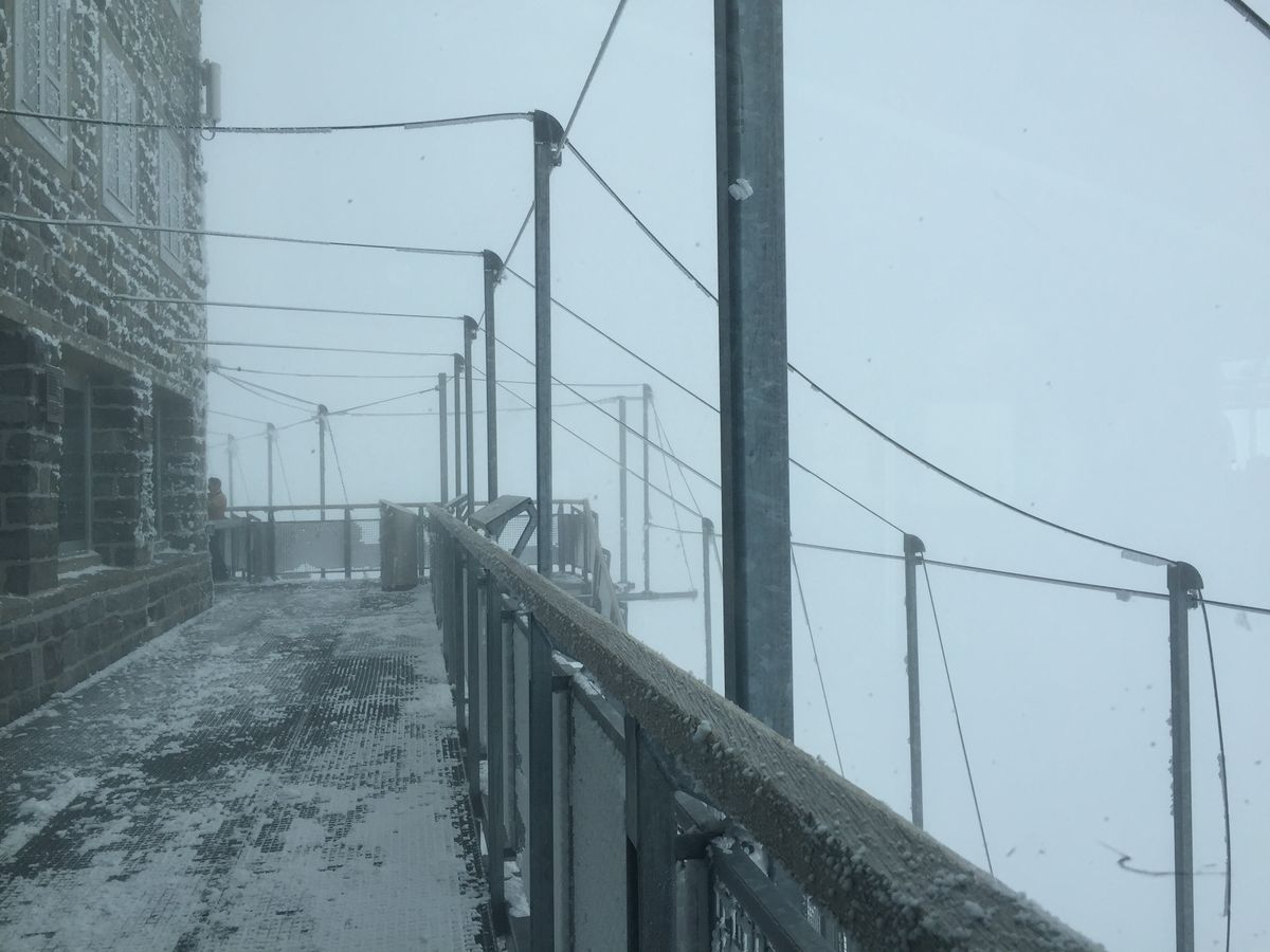 いよいよ登山鉄道への乗車でしたが、雨は降り続いたままで、高度が上がるごとに吹雪へと変わってきました。展望台へは上がれましたが、残念ながら一面真っ白で何も見えませんでした。展望台の前にパノラマシアターがあったため、晴れていたらさぞ素敵なんだろうと思います。他にも氷の宮殿やリントの直売店があり、自由時間はあっという間に終わりました。下車時にチラッと見えた山々の風景はとても素晴らしかったです。