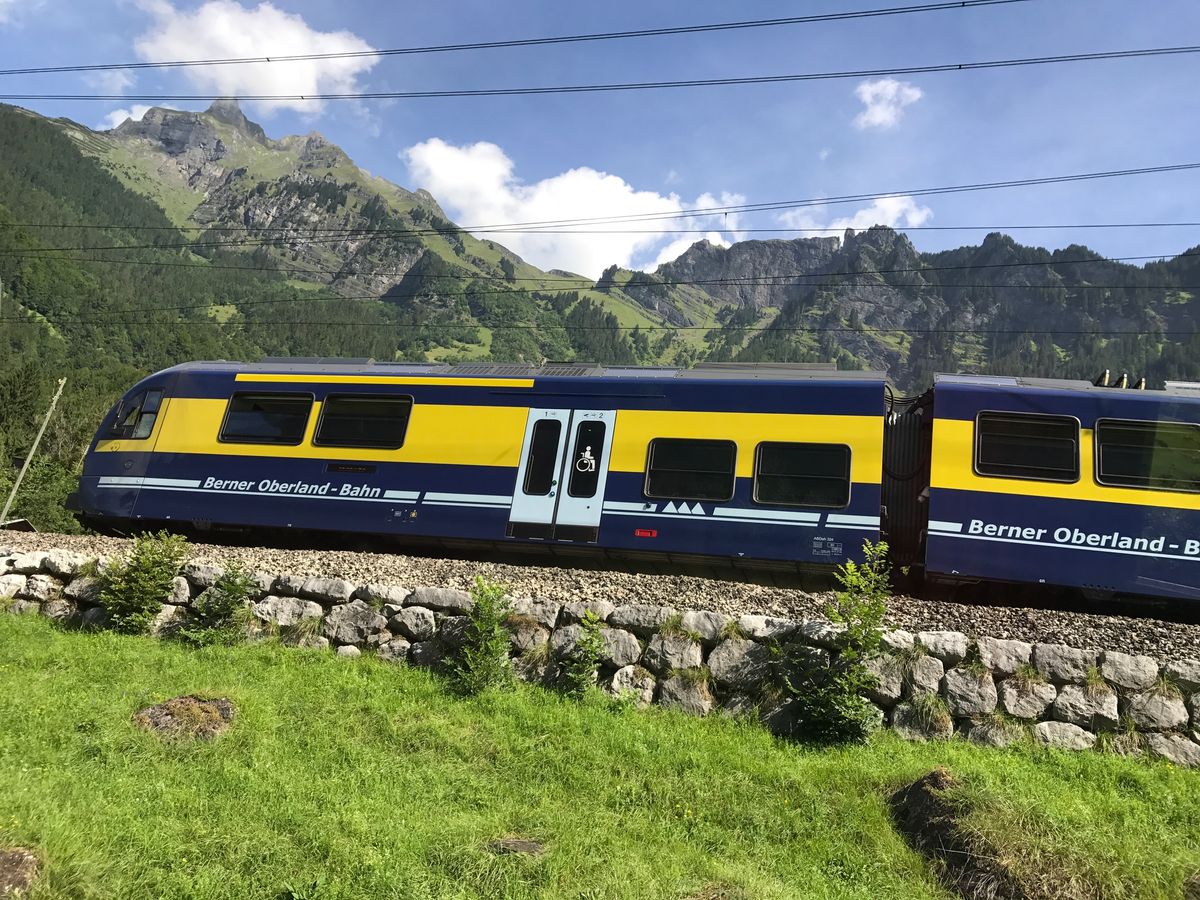 11:00インターラーケン出発し登山鉄道の駅で鉄道列車に乗車。バス、電車共に行き帰り左側が良い景色が楽しめる。