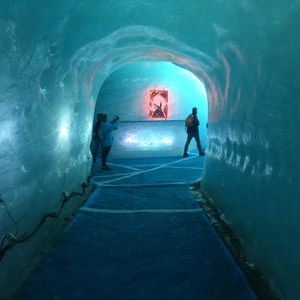 下山後徒歩で10分弱のグラス行きの駅に移動する。13時50分の汽車に乗り鉄道からの景色はまあまあ。ただ、頂上展望台からの景色は素晴らしい。頂上で降りて8人乗りくらいのゴンドラに乗り谷底の氷河の手前に行き、更に450段の階段を下り氷河トンネルの入口に行く。帰りに登ることを考えたら辛い。中は、そこまで辛い思いまでして見に行く程のものか私的に疑問です・・・。