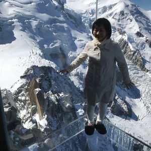 9月5日、一人参加でしたので気ままに過ごしたいと思い、エギーユ・ディ・ミディのケーブルカー(ゴンドラ)とメール・ド・グラス氷河へのツアーのみで食事無しで参加しました。天気予報に反してほぼ快晴の好天に恵まれ、エギーユ・ディ・ミディの展望台からはマッターホルンまで眺められ、モンブランは双眼鏡で見れば登山者が見えるくらいでした。「Pas dans le Vide(空中の一歩)」は強化ガラスの箱に入って足下まで展望できるもので、グループごとに写真を撮ってもらえます。私は一人でしたので係員のお兄さんと一緒に写真に映り、楽しい思い出になりました。