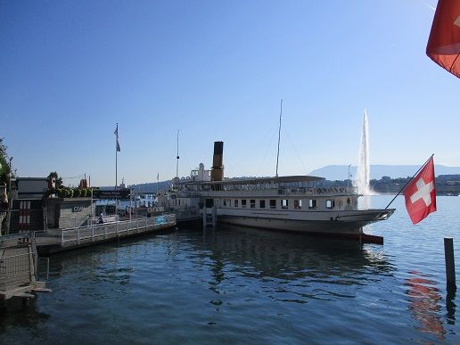 汽笛とともに出発し、大噴水を間近に見ながらレマン湖クルーズは始まりました。湖面から涼しい風が吹き気分爽快でした。まずはレストランに席の予約をして、その後はのんびりとクルーズを楽しみます。