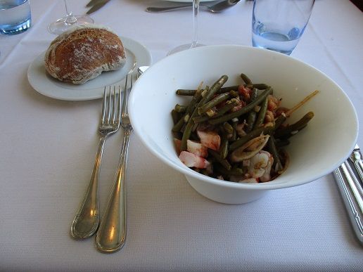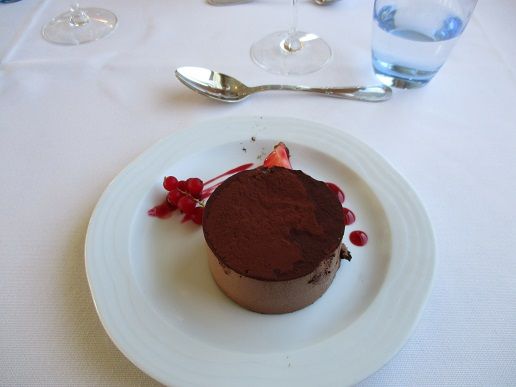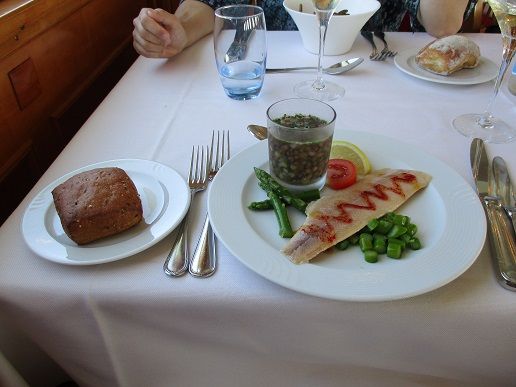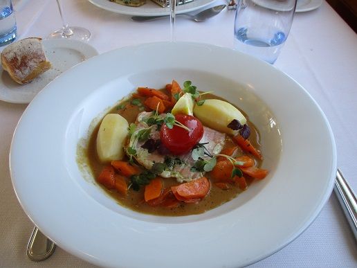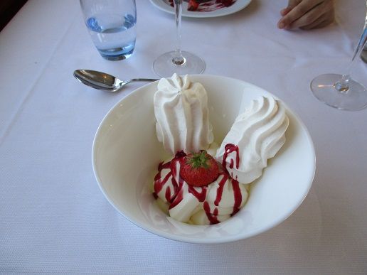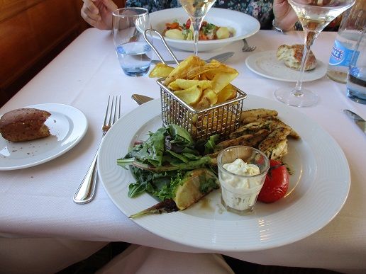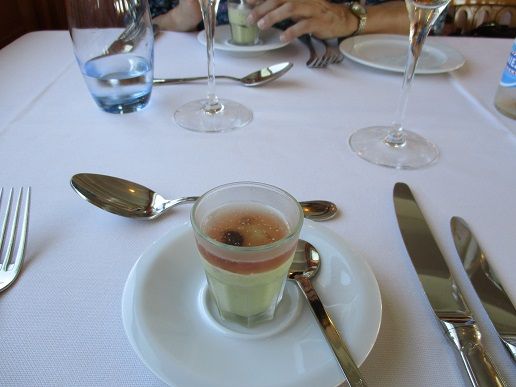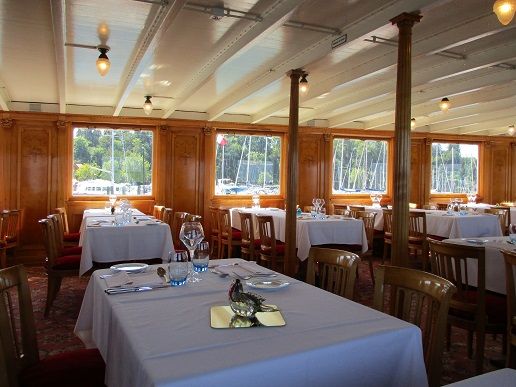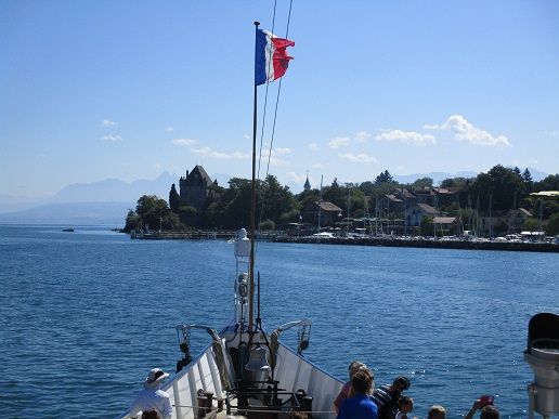 船はLausannne行きですが、そこまでに何か所か寄ります。レマン湖北岸がほとんどですが、1か所、湖を横断して南岸にあるフランスのYvoireにも寄ります。食事を予約した時間がちょうどこのYvoireを出港した時間で、1階にあるレストランに向かいました。